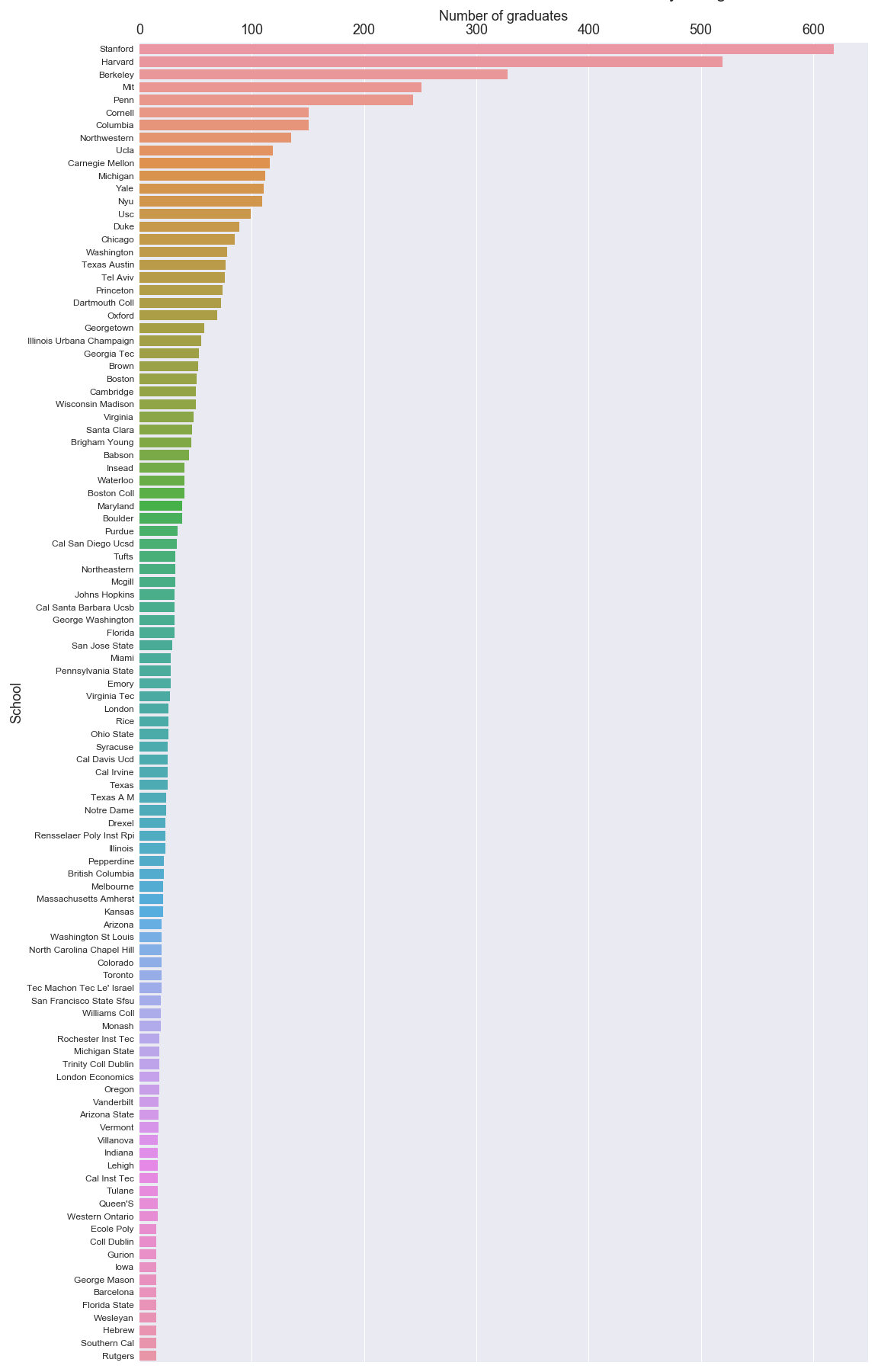 Using this metric, we find that slightly more than 25% of the companies in the Crunchbase dataset raised over $10 million in funding rounds, and so we select this subset as “the top businesses”. For the more than 7,000 companies in that sample, we match individuals (who are paired with degree information) to those companies. Together, the degree information for successful companies let’s us create a visual to show how many degrees each university has conferred to affiliates of all companies in the top tier of fundraising businesses.