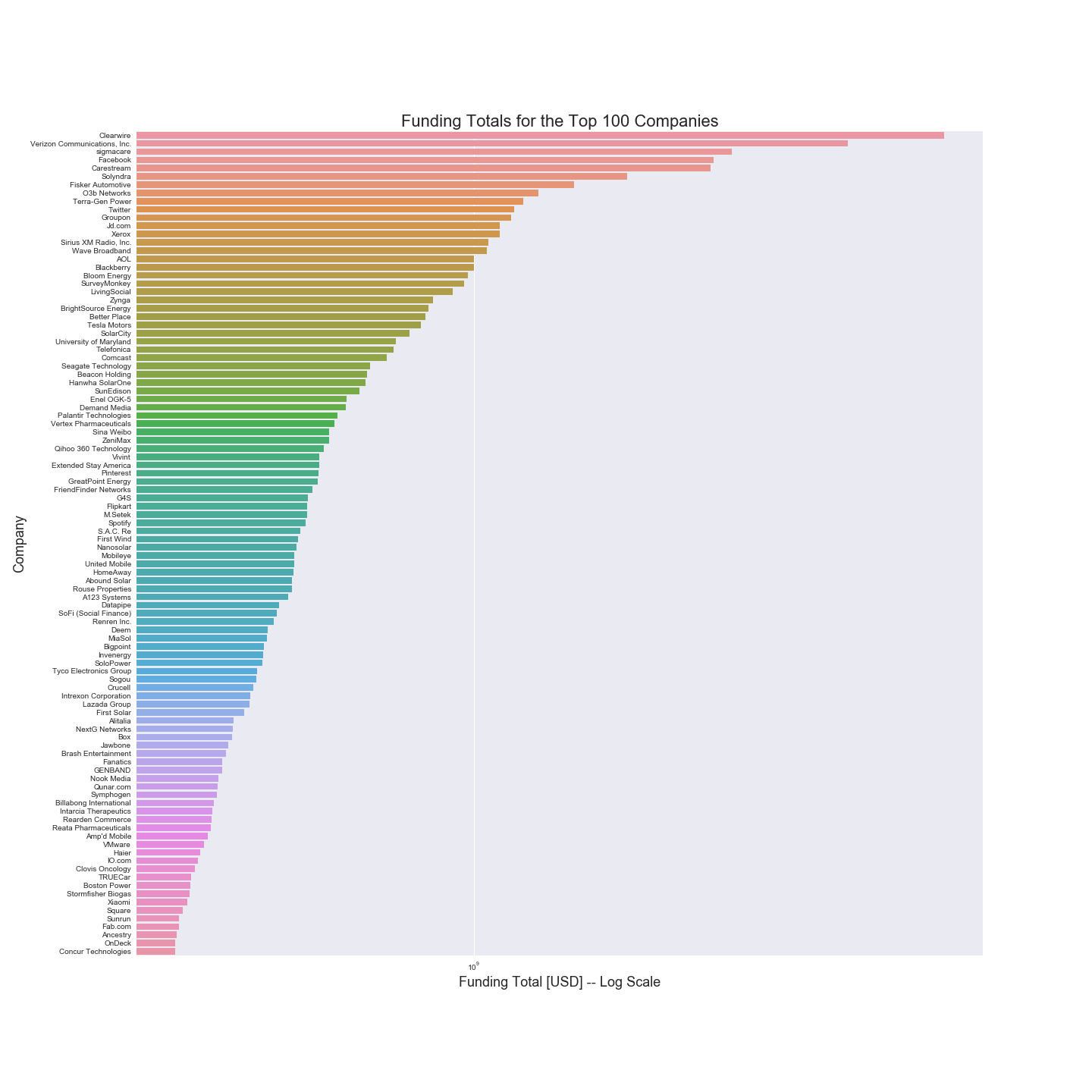 To answer these questions, we first need to define a benchmark for a company’s success. This could simply be whether the company is still operating or not (presumably companies that are not still operating were unsuccessful), or it could also be related to the company’s total valuation. Instead, we use the total funding acquired in all funding rounds for a company. Note that this is itself an imperfect metric. Some highly successful companies might require less capital investment than others, so this statistic could be biased in favor of capital intensive companies. We will assume that this is not so overwhelming to render the metric worthless. Funding totals for the top 100 businesses are plotted below.